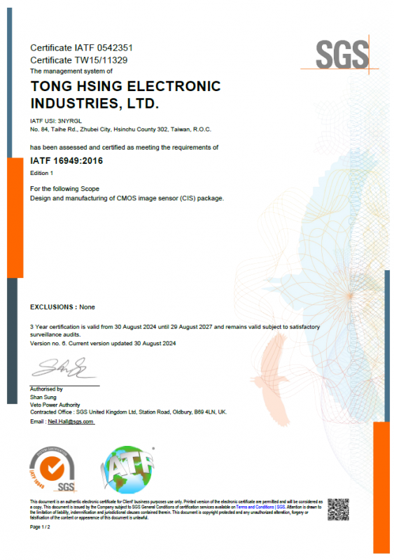 IATF 16949 is a standard developed by the International Automotive Task Force (IATF) based on the framework of the ISO 9001:2015 quality management system. IATF 16949:2016 is applicable to organizations that provide production and service of spare parts related to the automotive industry. The IATF 16949 standard aims at "zero defects" and emphasis the concepts of customer orientation, risk management and supplier control, and supplier control processes, as well as more requirements for products with special characteristics, in order to improve quality management for the entire automotive and motorbike industry. TONG HSING ELECTRONIC IND., LTD. has obtained this certification since 2018,