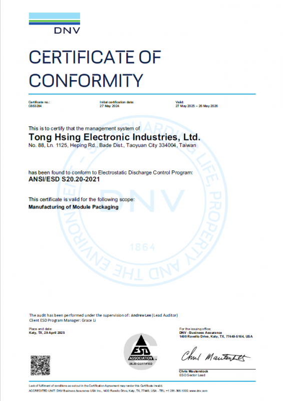 This standard is compiled by the American Electrostatic Protection and Control Association (ESDA) and is used as an implementation standard for electrostatic protection and control systems in the electronics, electrical, and communications industries. ANSI/ESD S20.20 is an electrostatic discharge protection and control system established on the basis of the ISO9001 quality management system. The ANSI/ESD 20.20 standard sets out the requirements for the establishment of ESD systems in factories, the establishment of EPAs, the packaging of sensitive components, the control of all aspects of production, personnel training and assessment, and testing methods. This standard is designed to protect electrostatic sensitive parts (electrical and electronic components, assemblies and devices) by establishing a static protection management control procedure and systematically implementing protective measures to reduce static discharge damage to electrostatic sensitive parts. TONG HSING ELECTRONIC IND., LTD. has obtained this certification in 2019.