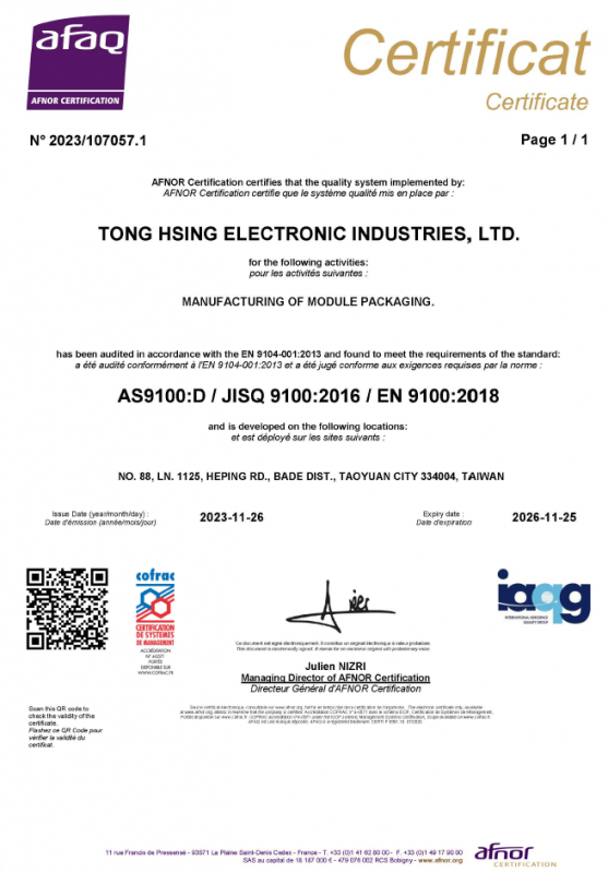 AS9100 is a quality and risk management standard for the aerospace industry, focusing on the integrity and rigor of aerospace quality management systems (AQMS), and is based on ISO 9001. Safety, quality and reliability are of paramount importance to the aerospace industry. In order to ensure that all partners meet the quality requirements of the industry, this series of standards takes into account the design, development, production, maintenance and trade aspects of the aerospace industry. TONG HSING ELECTRONIC IND., LTD. was certified in 2010 in the areas of design, development and production.