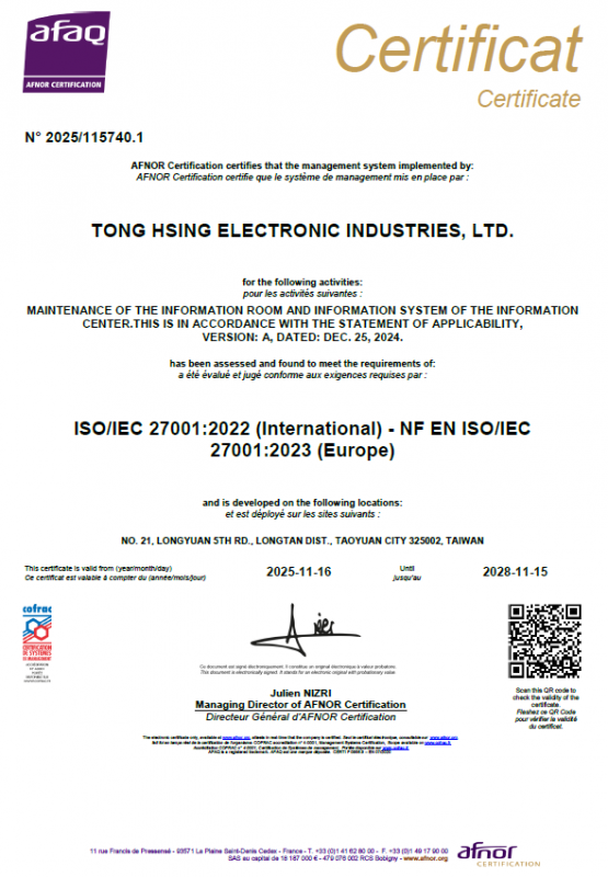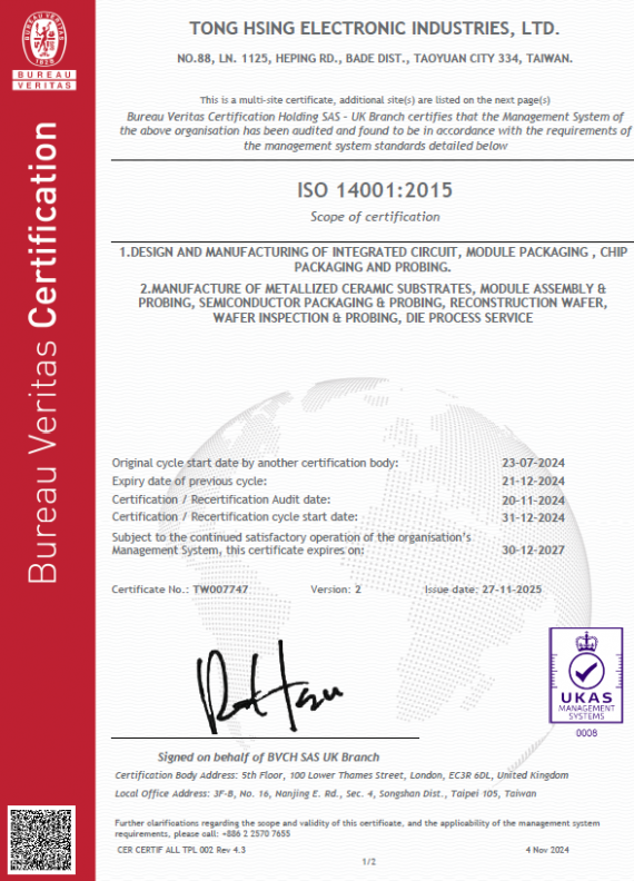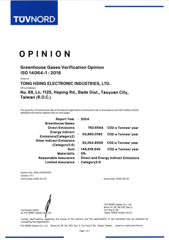 The aim of ISO 14001:2015 is to provide a framework for businesses to protect the environment and balance it with changes in socio-economic environmental conditions. The requirements of ISO 14001:2015 enable organizations to achieve the desired outcomes set by the Environmental Management System. ISO 14001:2015 provides a systematic approach for the management level to receive complete information to successfully establish long-term goals and create feasible measures to promote sustainable climate development. TONG HSING ELECTRONIC IND., LTD. has obtained this certification since 2002.