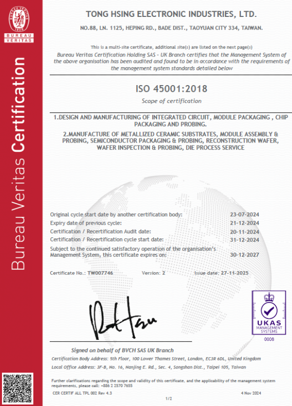 ISO 45001:2018 Occupational safety and health management system was officially released in March 2018 and has become a globally consistent standard for the validation of occupational safety and health management systems. The aim of ISO 45001 is to prevent work-related injuries and illnesses and to provide a safe and healthy workplace. Since 2017, TONG HSING has been certified to ISO 45001 Occupational Safety and Health Management System, demonstrating TONG HSING's commitment to ensuring sound working conditions, health, well-being and equality of practice for its employees.