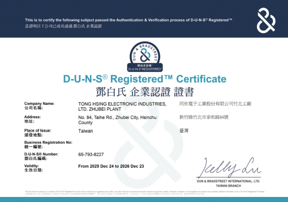 D-U-N-S® Certification is a globally recognized symbol of authority in business credit evaluation, showcasing a company's excellence in financial stability, operational capability, and credit management. Tong Hsing is committed to providing a transparent, secure, and trustworthy collaborative environment, delivering professionalism and integrity to our clients. This not only highlights our competitiveness and credibility in the market but also reflects our strong commitment to clients and partners, striving to become a trusted long-term partner.
